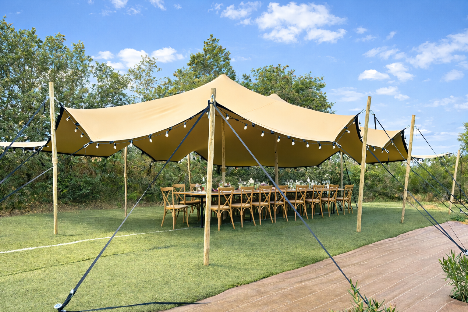 Une tente de réception installée face à la piscine, du mobilier bistrot en bois (tables et chaises), ainsi qu’une véranda cosy avec vue sur l’eau créeront une ambiance chaleureuse et festive.